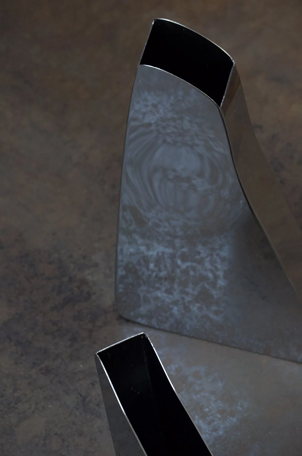 These vases are made from stainless steel and coated with reflective chrome. Each piece is unique and carefully crafted- ed by hand intuitively into its shape using heat. Reflections are distorted by the curvature of the shapes, just like the water of the ocean.